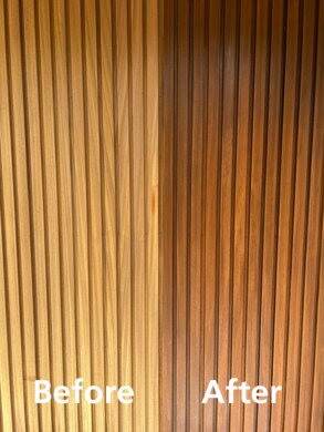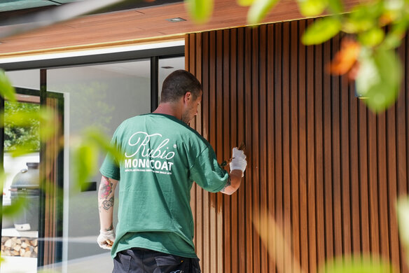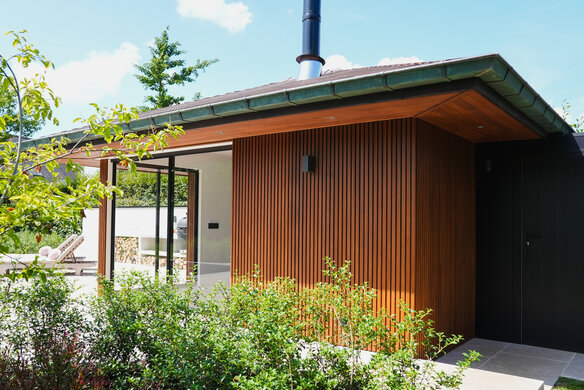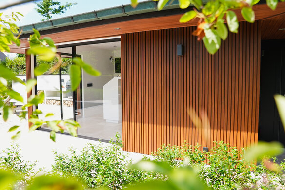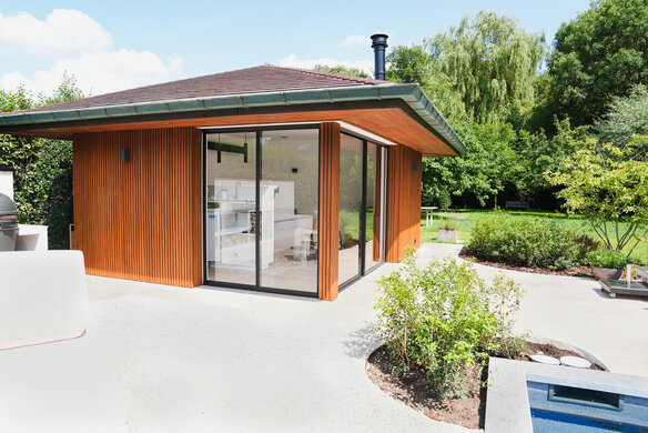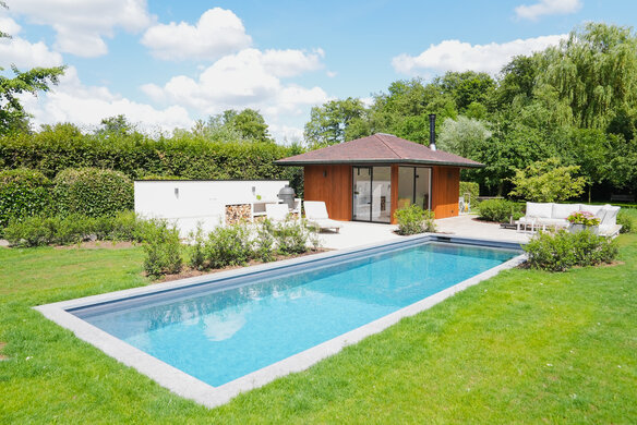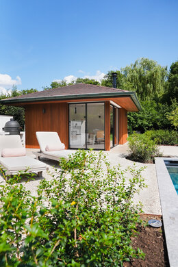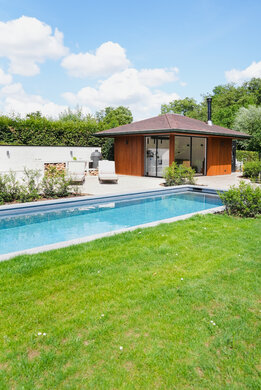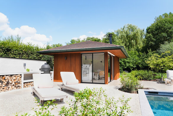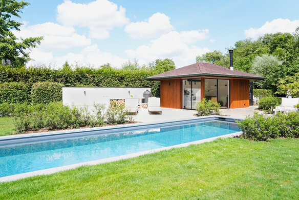 Questa casetta per piscina in termo ayous è stata rifinita con DuroGrit per una protezione ottimale dai raggi UV. Il colore Foxy Brown è stato scelto per riprodurre al meglio l'aspetto naturale e umido di questo tipo di legno.