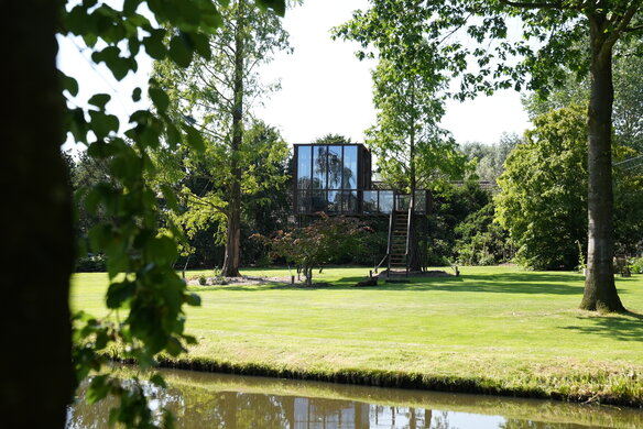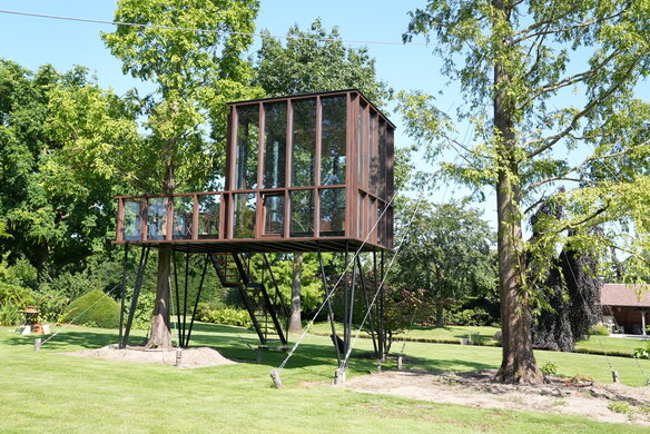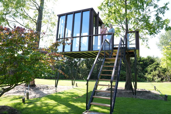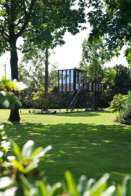 Una rivisitazione elevata e sofisticata di un progetto classico dell'infanzia. HogerHuis ha realizzato questo progetto moderno ed elevato utilizzando il legno Afzelia. È dotata di finestre a tutta altezza su tutti i lati e porta una casa sull'albero convenzionale a nuove altezze!