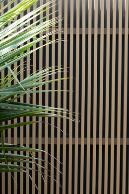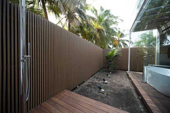 Il nostro posto preferito in questa casa? Il bagno che si affaccia su un piccolo cortile e sulle palme! Il bagno e la doccia si trovano addirittura su una terrazza.